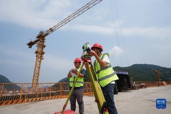5月4日,在重慶市北碚區(qū)渝武高速復線觀音峽嘉陵江特大橋,中交一公局四公司橋梁工區(qū)工作人員孫培耕(右)和彭昭屏在對橋面高程及軸線偏位進行測量。