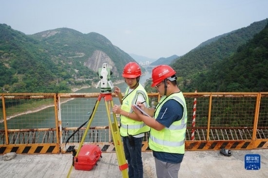 5月4日,在重慶市北碚區(qū)渝武高速復線觀音峽嘉陵江特大橋,中交一公局四公司橋梁工區(qū)工作人員孫培耕(左)和彭昭屏在對橋面高程及軸線偏位進行測量。