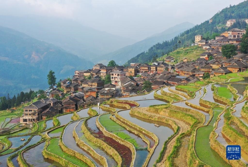 5月6日拍攝的貴州省從江縣加榜鄉(xiāng)加車村的梯田(無(wú)人機(jī)照片)。