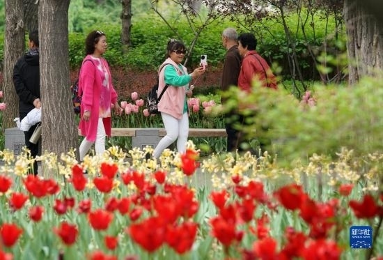 近日,山西省太原市迎澤公園內(nèi)各色郁金香競相綻放,吸引游人前來觀花賞景。