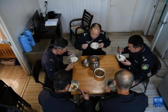 4月20日,在黃山風景區(qū)平天矼瞭望哨內,瞭望哨防火小隊5名隊員在吃晚飯,右一為秦志平。