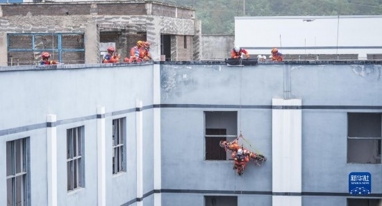安順消防救援支隊(duì)隊(duì)員在進(jìn)行高空救援演練(5月11日攝)。