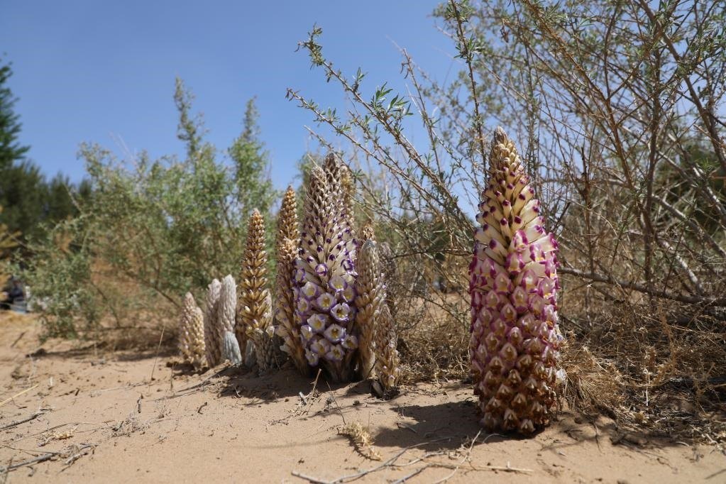 記者在四翅濱藜肉蓯蓉試種基地看到,一株株四翅濱藜綠意盈盈,在其根部生長的一排排肉蓯蓉破土而出,一株最多長出40多株肉蓯蓉,五顏六色的肉蓯蓉花競(jìng)相開放,成為一道美麗的風(fēng)景。