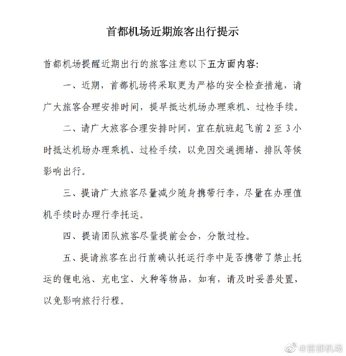 央視網(wǎng)消息:5月16日,@首都機(jī)場 官方微博發(fā)布提示:首都機(jī)場近期將采取更為嚴(yán)格的安全檢查措施,請廣大旅客合理安排時(shí)間,提早抵達(dá)機(jī)場辦理乘機(jī)、過檢手續(xù)。