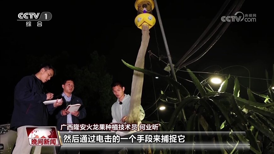 隆安火龍果種植技術(shù)員 何業(yè)昕:這個燈的話叫做幼蟲燈,主要是通過一個燈光發(fā)出了一些光譜來吸引一些害蟲來,然后通過電擊的一個手段來捕捉它,然后集合到這個袋子里面。像這種燈的話,我們一般是20到25畝地放一盞,一個物理防治的手段。