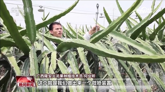 隆安火龍果種植技術(shù)員 何業(yè)昕:高溫來的時候,我們的火龍果雖然說也能開花能結(jié)果,但是商品性非常的差。這個就是我們做出來一個微噴裝置。在夏季高溫的時候,我們通過一個噴水,一個霧化的噴水出來之后,達(dá)到整個園子全部降溫,降到5度到8度左右。