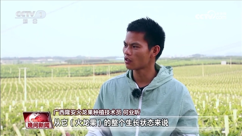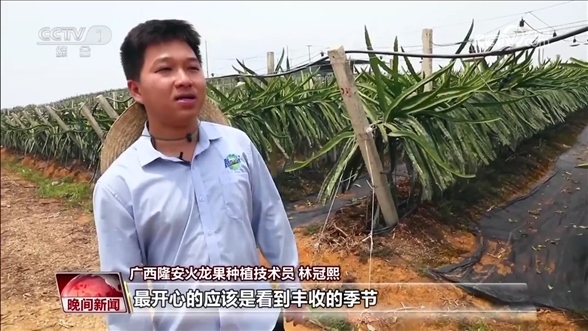 隆安火龍果種植技術(shù)員 林冠熙:不再是以前的那種面朝黃土背朝天的農(nóng)業(yè)模式,有時我們可能在電腦面前點(diǎn)開開關(guān),我們就可以給植物灌水灌肥。最開心的應(yīng)該是看到豐收的季節(jié),看到滿地滿果通紅的畫面,就覺得這是豐收的喜悅。