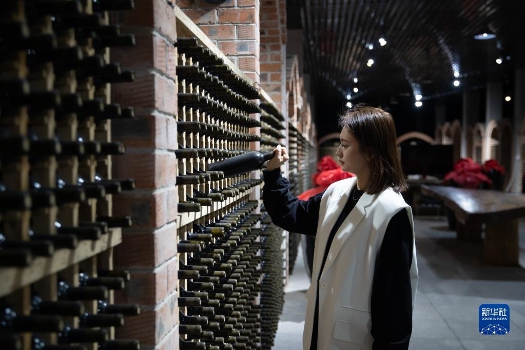 5月19日,在越橘莊園酒窖內(nèi),工作人員在檢查藍(lán)莓酒儲(chǔ)藏情況。