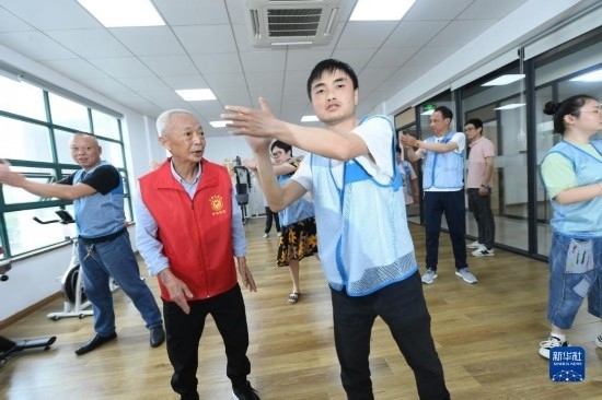 5月29日,在湖州市環(huán)渚街道玉堂橋社區(qū),凌法林(左二)帶領(lǐng)殘障人士做操。
