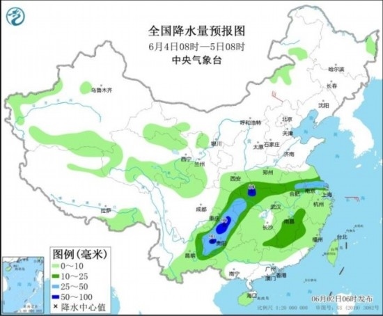 2日至4日,青海東部、甘肅南部、陜西南部、四川東部、重慶、貴州、湖北西部及河南南部、安徽北部等地部分地區(qū)將有中到大雨,局地有暴雨或大暴雨,并伴有雷暴大風(fēng)或短時強降水等強對流天氣。其中,6月2日08時至3日08時,黑龍江東南部、貴州北部等地的局地將有雷暴大風(fēng)或冰雹天氣;黑龍江東南部、湖北西部、湖南東南部、江西南部、四川東部、重慶、貴州中西部和東北部、云南南部、廣西北部、廣東東部和北部等地的部分地區(qū)將有短時強降水天氣,小時雨量20~40毫米,局地可達50毫米以上。