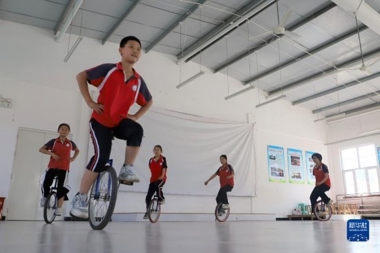 6月15日,在河北省滄州市吳橋縣馬庫(kù)吏小學(xué),學(xué)生練習(xí)雜技獨(dú)輪車(chē)。
