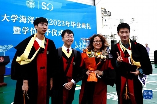 當日,上海交通大學海洋學院2023年畢業(yè)典禮暨學位授予儀式在“雪龍2”號上舉行,70余名畢業(yè)生在甲板上與師長道別?!把?”號是我國自主建造的第一艘極地科學考察破冰船。