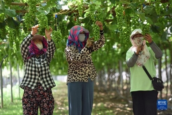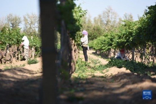 6月21日,在河北省懷來(lái)縣的豐禾葡萄基地,當(dāng)?shù)剞r(nóng)民在進(jìn)行葡萄管理。
