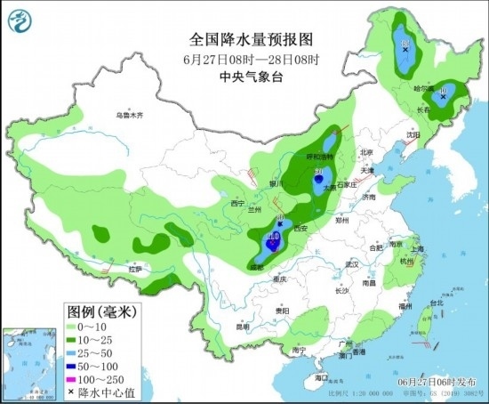 6月27日08時至28日08時,甘肅東南部、陜西、四川盆地、內(nèi)蒙古中部和東北部、山西西部、黑龍江西部和東南部、吉林東北部、廣東東南部等地部分地區(qū)有中到大雨,其中,山西西部、陜西西南部、四川盆地北部等地部分地區(qū)有暴雨或大暴雨(100~110毫米)。西北地區(qū)東部、華北、江南東部、西藏南部等地部分地區(qū)有4~6級風(fēng),其中,內(nèi)蒙古西北部部分地區(qū)有6~7級風(fēng)(見圖2)。