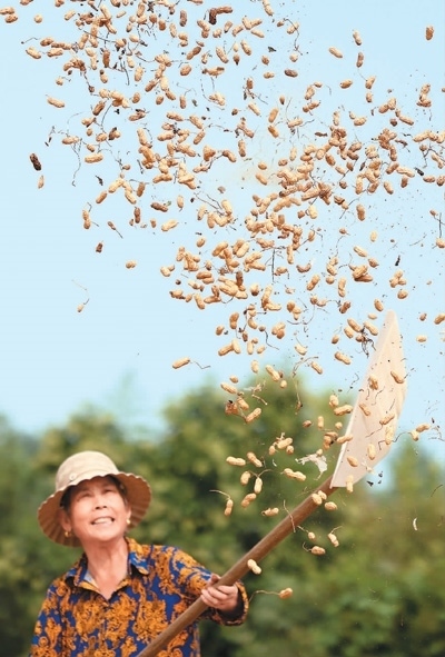 山東省棗莊市市中區(qū)稅郭鎮(zhèn)沙溝村,農民在揚曬花生。 孫中喆攝(人民視覺)