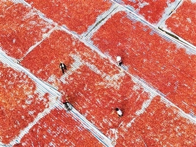 安徽省亳州市譙城區(qū)雙溝鎮(zhèn)任小廟村,農民在晾曬剛采收的辣椒。 劉勤利攝(人民視覺)