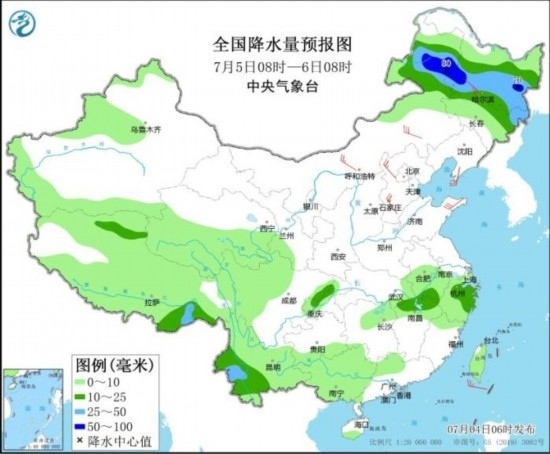 7月5日08時至6日08時,內(nèi)蒙古東部、黑龍江中南部、吉林北部、云南西部和南部、江西北部、浙江北部等地部分地區(qū)有中到大雨,其中,內(nèi)蒙古東北部、黑龍江西南部等地局地有暴雨(50~80毫米)。內(nèi)蒙古、黑龍江、遼東半島、河北等地部分地區(qū)有4~6級風(fēng)。
