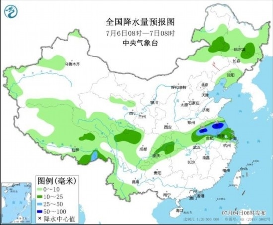 7月6日08時至7日08時,內(nèi)蒙古東北部、黑龍江南部、吉林北部、西藏東部、川西高原北部、重慶、江淮大部、江南東北部等地部分地區(qū)有中到大雨,其中,河南東南部、蘇皖北部等地部分地區(qū)有暴雨(50~80毫米)。內(nèi)蒙古中部等地部分地區(qū)有4~5級風(fēng)。