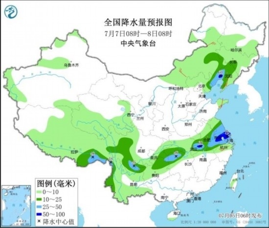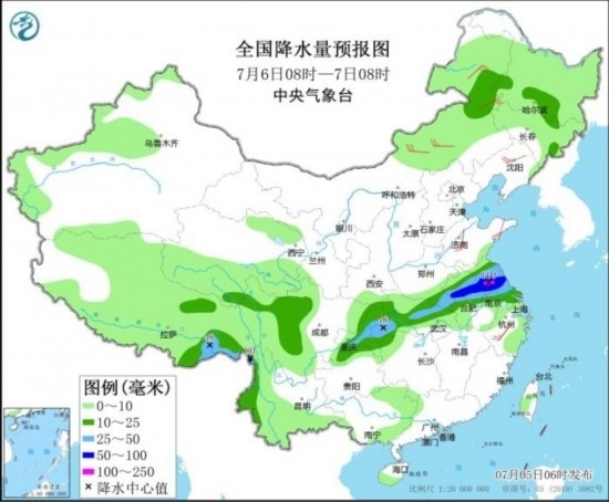 全國降水量預報圖(7月6日08時-7日08時)。圖片來源:中央氣象臺網(wǎng)站