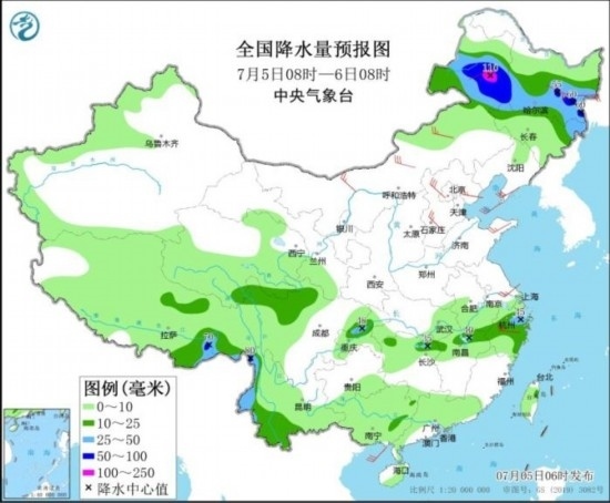 全國降水量預報圖(7月5日08時-6日08時)。圖片來源:中央氣象臺網(wǎng)站