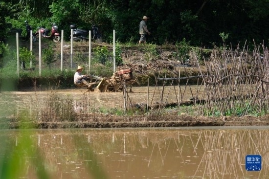 7月21日,農(nóng)民在南寧市青秀區(qū)長(zhǎng)塘鎮(zhèn)耕田。新華社記者 周華 攝