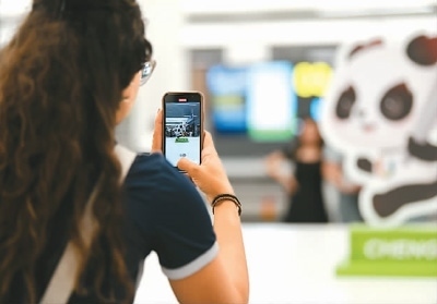 成都天府國(guó)際機(jī)場(chǎng)內(nèi),抵蓉的巴西代表團(tuán)成員在等候行李時(shí)拍攝機(jī)場(chǎng)內(nèi)的大運(yùn)會(huì)吉祥物“蓉寶”裝飾。新華社記者 胥冰潔攝