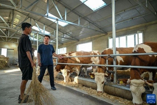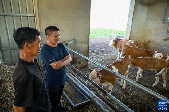 8月3日,在扎魯特旗巨日合鎮(zhèn),百順養(yǎng)殖專業(yè)合作社負責(zé)人楊紹武(右)和養(yǎng)殖戶李和查看牛犢繁育情況。