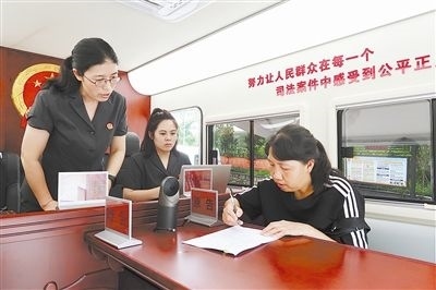 圖③:干警在“車載便民法庭”對調(diào)解協(xié)議現(xiàn)場進行司法確認。