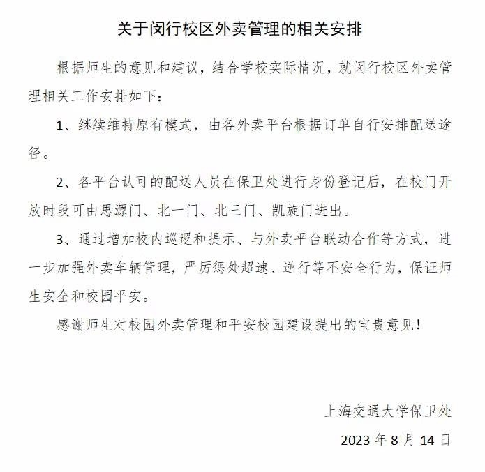 8月14日晚6點,有上海交大學生向記者反映,學校已更新關(guān)于閔行校區(qū)外賣管理的相關(guān)安排。安排顯示,維持原有模式,由各外賣平臺根據(jù)訂單自行安排配送途徑,各平臺認可的配送人員在保衛(wèi)處進行身份登記后,在校門開放時段可由學校四個校門進出;學校會通過增加校內(nèi)巡邏和提示,與外賣平臺聯(lián)動合作等方式,進一步加強外賣車輛管理,嚴厲懲處超速、逆行等不安全行為,保證師生安全和校園平安。當晚,澎湃新聞記者了解到,閔行校區(qū)已有保安人員接到上級通知,維持原有模式,多名外賣騎手也從學校保安人員處獲知可正常進出校園。