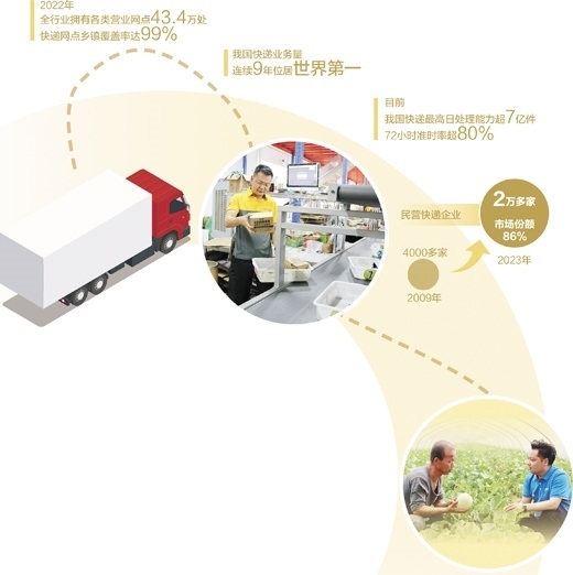 上圖:徐峰在查看快遞分撥情況。本報記者 王永戰(zhàn)攝 下圖:趙大榮(右)在為村民講解甜瓜包裝技術(shù)。受訪者供圖數(shù)據(jù)來源:國家郵政局