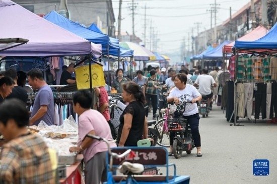 8月25日,在天津市靜海區(qū)臺頭鎮(zhèn),前來趕集的村民在大集上購買商品。