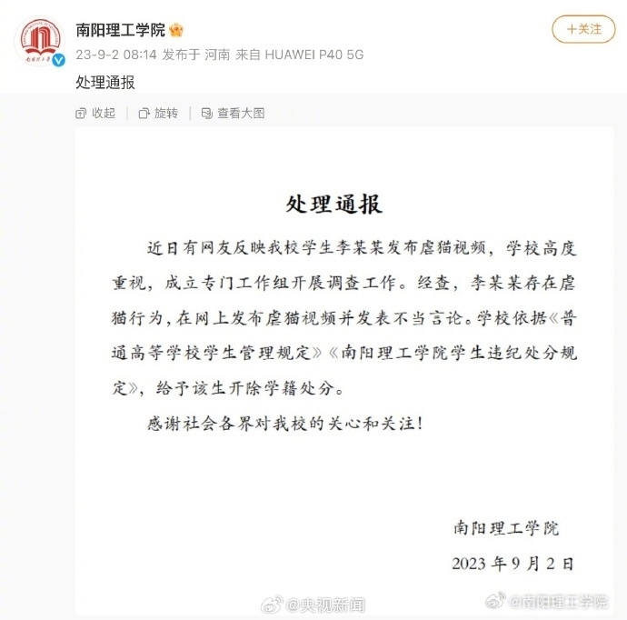 ·南陽理工學(xué)院再通報(bào):對(duì)涉事虐貓學(xué)生給予開除學(xué)籍處分。