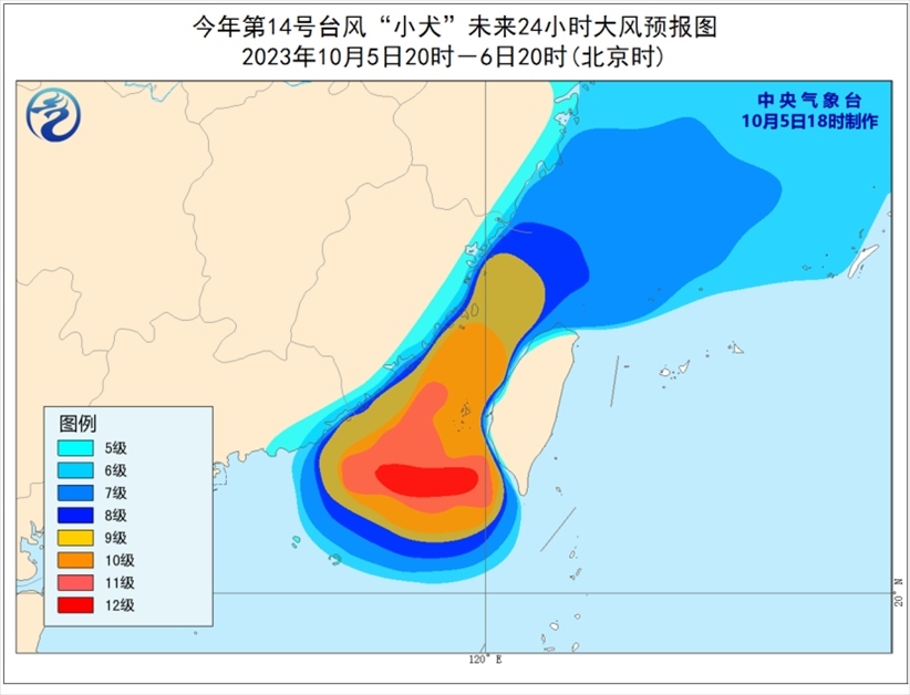 大風(fēng)預(yù)報(bào):5日20時(shí)至6日20時(shí),東海大部及釣魚島附近海域、巴士海峽西北部、臺(tái)灣海峽、南海東北部以及浙江沿海、福建沿海、廣東東部沿海、臺(tái)灣島北部沿海將有6-8級(jí)、陣風(fēng)9-10級(jí)的大風(fēng),其中巴士海峽西北部、臺(tái)灣海峽、南海東北部等地部分海域?qū)⒂?-10級(jí)、陣風(fēng)11-13級(jí)的大風(fēng),“小犬”中心經(jīng)過的附近海面風(fēng)力有11-13級(jí),陣風(fēng)14-15級(jí)。