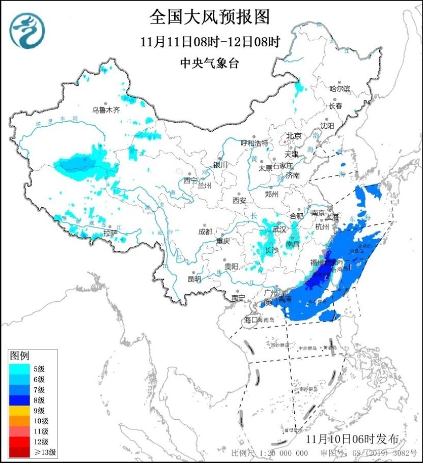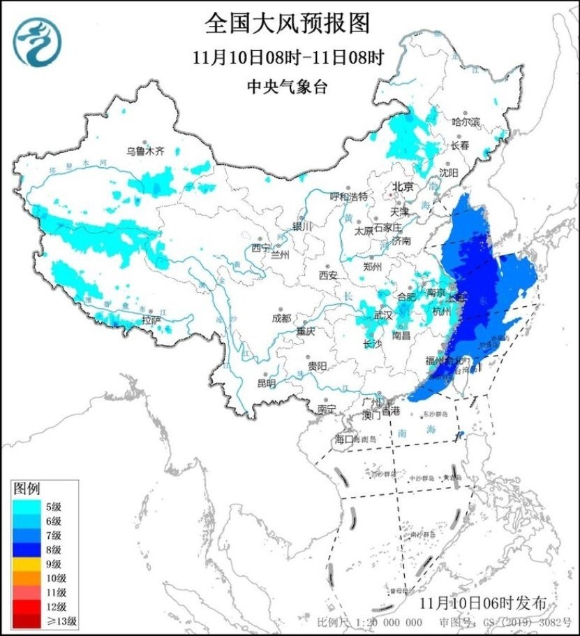 11月10日08時至11日08時,內(nèi)蒙古中東部、遼寧西部、安徽中南部、河南南部、江蘇南部、上海、湖北南部、湖南東北部、江西北部、浙江北部及東部沿海、福建沿海、臺灣島沿海等地有5~6級、陣風(fēng)7~8級的大風(fēng);黃海大部海域、東海大部海域、臺灣海峽、臺灣以東洋面偏北海域、南海東北部偏北海域?qū)⒂?~8級、陣風(fēng)9~10級的大風(fēng)。11月11日08時至12日08時,安徽南部、湖北中東部、湖南大部、江西中北部、廣西東北部以及福建沿海、廣東東部沿海、臺灣島沿海等地有5~6級、陣風(fēng)7~8級的大風(fēng);東海大部海域、臺灣海峽、臺灣以東洋面、南海北部海域、巴士海峽偏北海域?qū)⒂?~8級、陣風(fēng)9~10級的大風(fēng)。中央氣象臺11月10日06時繼續(xù)發(fā)布大風(fēng)藍色預(yù)警(見圖2、3)。