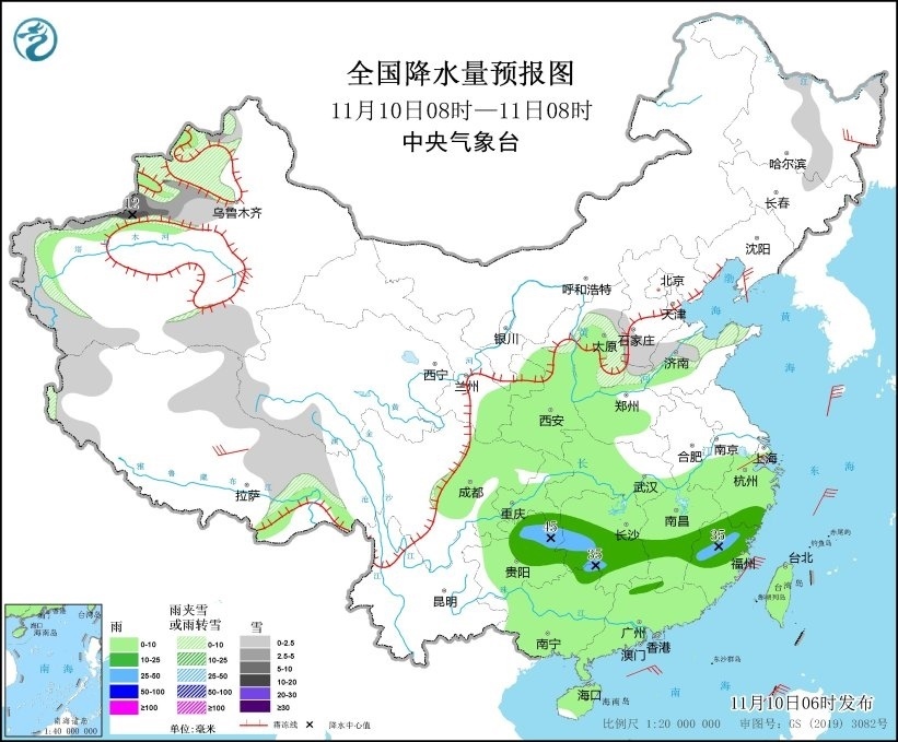 11月10日08時至11日08時,新疆西部和南疆南部、西藏西部和北部、青海南部、黑龍江東部、吉林北部、山西北部、河北南部、山東西部等地部分地區(qū)有小到中雪或雨夾雪,其中,新疆伊犁河谷和沿天山一帶等地部分地區(qū)有大雪,局地暴雪(10~12毫米)。重慶東南部、貴州東部和北部、湖南中南部、江西中南部、浙江南部、福建中北部以及廣西東北部等地部分地區(qū)有中雨,其中,貴州東北部、湖南西部、福建西北部等地部分地區(qū)有大雨(25~45毫米)。黑龍江東北部、遼東半島、新疆南疆盆地、西藏北部、浙江北部等地部分地區(qū)有4~6級風(fēng)(見圖4)。