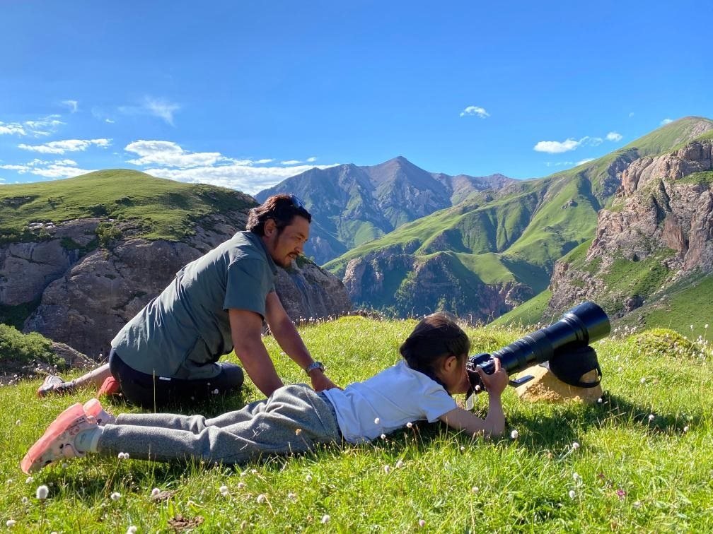 2020年7月,達杰在指導女兒拍攝雪豹。(受訪對象供圖)