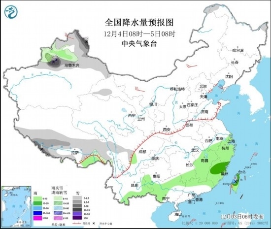 12月4日08時至5日08時,新疆北部、西藏西南部和東部等地部分地區(qū)有小到中雪或雨夾雪,其中,新疆北疆東部和沿天山地區(qū)、西藏西南部等地部分地區(qū)有大到暴雪,局地大暴雪(20~25毫米)。江南大部、云南東部和南部、華南北部和西部、臺灣島等地部分地區(qū)有小到中雨,其中,臺灣島中北部等地部分地區(qū)有大雨(25~40毫米)。內(nèi)蒙古中西部、遼東半島、新疆北部等地部分地區(qū)有4~6級風(fēng)。
