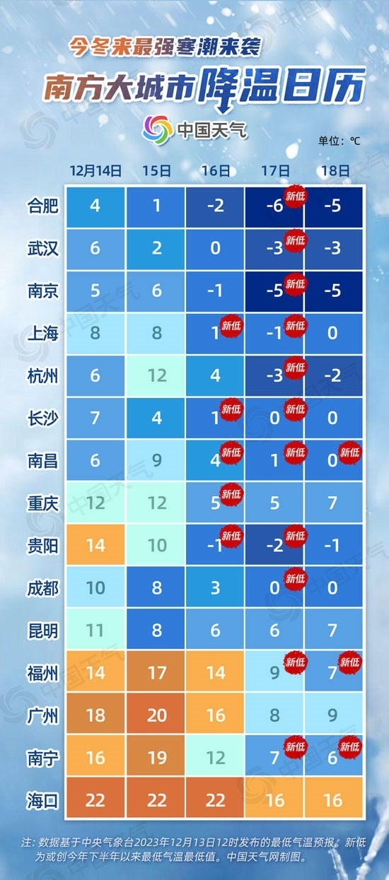 從中國(guó)天氣網(wǎng)推出的南方大城市降溫日歷來看,未來五天,合肥、武漢、南京、上海、杭州、貴陽(yáng)最低氣溫都將逐步下降到冰點(diǎn)以下。南昌16日至18日最低氣溫或連創(chuàng)新低,貴陽(yáng)最低氣溫將從14℃降至-2℃,降幅可達(dá)16℃。