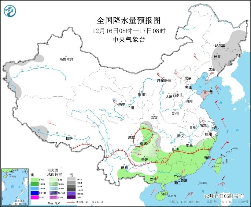圖7 全國降水量預報圖(12月16日08時-17日08時)