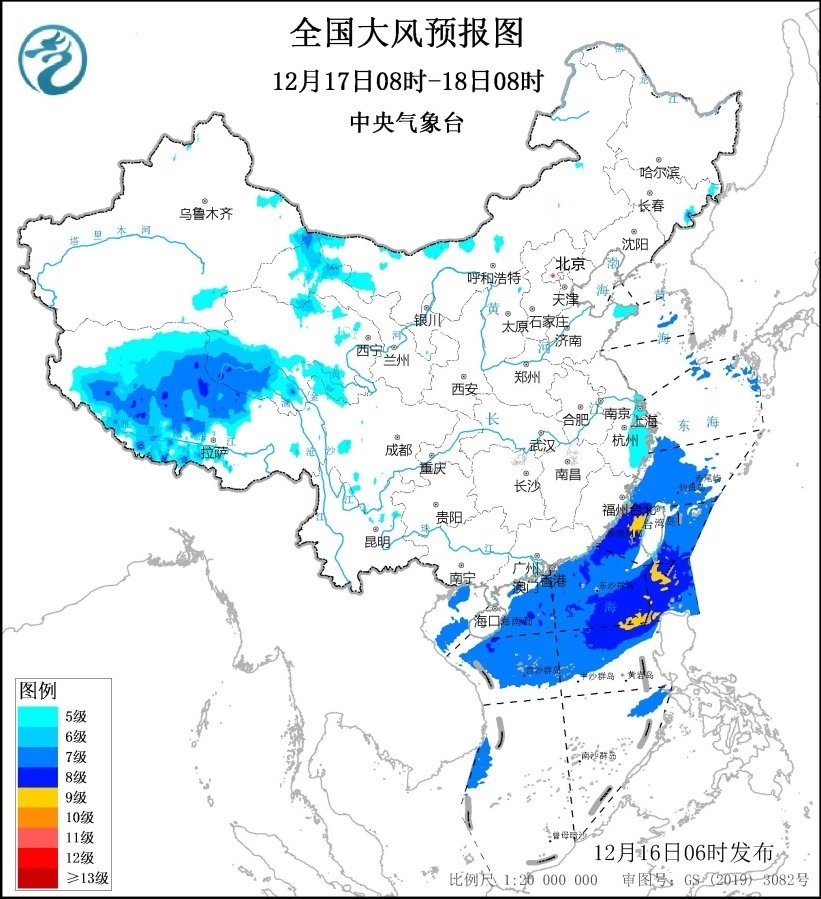 預(yù)計,12月16日08時至17日08時,內(nèi)蒙古中東部、西藏中西部、甘肅河西、河北北部、山東半島東部、江蘇南部、上海、浙江大部等地有5~6級、陣風7~8級的大風,其中,西藏西北部的部分地區(qū)有7~8級、陣風9~10級的大風;渤海、渤海海峽、黃海大部海域、東海大部海域、臺灣海峽、臺灣以東洋面、巴士海峽、南海北部和中部海域、北部灣將有7~8級、陣風9~10級的大風,其中臺灣海峽、巴士海峽和南海東北部的部分海域風力可達9級、陣風10~11級。