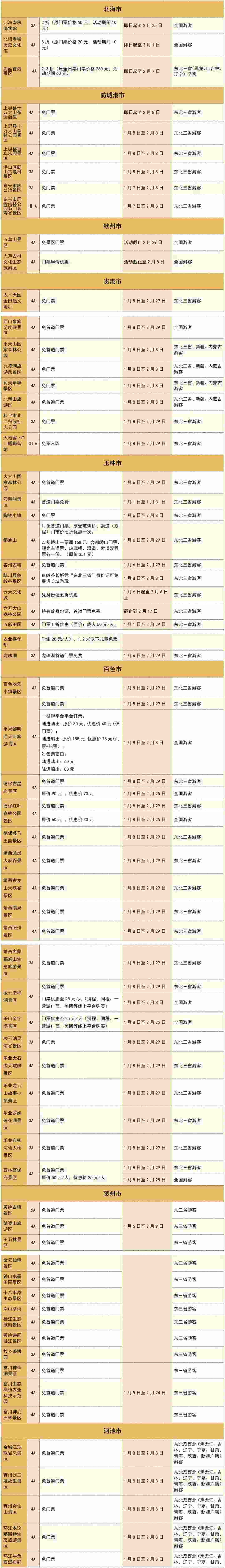 柳州程陽(yáng)八寨景區(qū)、桂林桂海晴嵐、百色靖西通靈大峽谷景區(qū)、百色樂(lè)業(yè)大石圍天坑群景區(qū)、賀州黃姚古鎮(zhèn)景區(qū)、河池羅城棉花天坑度假區(qū)、崇左德天跨國(guó)瀑布景區(qū)、崇左大新縣明仕景區(qū)、崇左左江花山巖畫景區(qū)等等,近兩百家廣西景區(qū)面向東北“老鐵”推出免門票或打折優(yōu)惠政策!此外,還有多家景區(qū)面向全國(guó)游客推出優(yōu)惠政策!