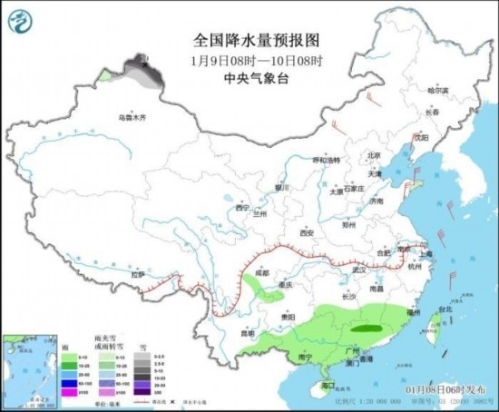全國降水量預報圖(1月9日08時-10日08時) 來源:中央氣象臺網(wǎng)站