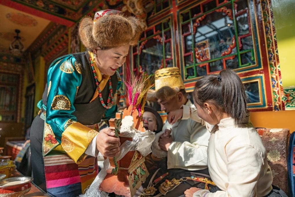 一家人按長(zhǎng)幼次序落座,女兒次仁普尺逐一為大家獻(xiàn)上切瑪,這也是新年的重要儀式,寓意五谷豐登、六畜興旺、家和萬事興。