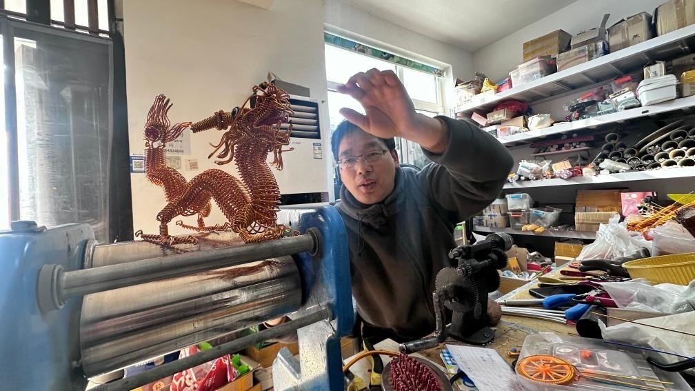 在村民楊訓(xùn)政不大的鋁編工作室內(nèi),簡易貨架上一排排銅色鋁線編制成的藝術(shù)品讓人目不暇接。一條條鋁制彈簧經(jīng)過村民巧妙處理后,成了工藝品市場的搶手貨:發(fā)財(cái)樹、恐龍、摩托車、機(jī)器人……“我這鋁編雖然產(chǎn)量低、規(guī)模小,訂單可已經(jīng)排到了今年10月底。龍年將至,來自海內(nèi)外的訂單讓大家年前忙得不亦樂乎?!睏钣?xùn)政一邊用鉗子擺弄著鋁編小龍,一邊告訴記者。