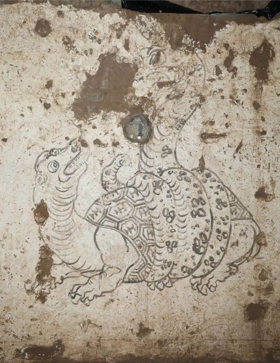 墓道處壁畫(huà)保存較差,僅墓道口處保留有少量畫(huà)面,兩壁分別為青龍、白虎圖樣;甬道兩側(cè)分別繪有三個(gè)侍女,僅存下半身;墓室東壁為樂(lè)舞圖,呈三段式布局,其中南側(cè)為十人組成的樂(lè)隊(duì),中部為女舞者,北部為觀看的貴婦(應(yīng)為墓主)及侍女;墓室北壁東側(cè)中心為一坐于方形高背扶手椅貴婦(應(yīng)為墓主),兩側(cè)站立有侍女,應(yīng)為表現(xiàn)墓主日常生活場(chǎng)景;墓室北壁西側(cè)為玄武圖,形象巨大,十分靈動(dòng);墓室西壁為六扇屏花草,畫(huà)面簡(jiǎn)單且潦草;墓室南壁為朱雀,呈雙翅展開(kāi)欲騰飛狀。該墓壁畫(huà)布局充實(shí)完整,畫(huà)面惟妙惟肖,內(nèi)容上有一定程度反映了墓主生前生活,體現(xiàn)出墓主情趣高雅,深居簡(jiǎn)出,柔貞以靜好,有美婦之懿烈兼瞿母之慈仁。墓葬壁畫(huà)整體上風(fēng)格及年代與讓皇帝李憲墓極為相近,或?yàn)楣灿靡环郾舅L制。