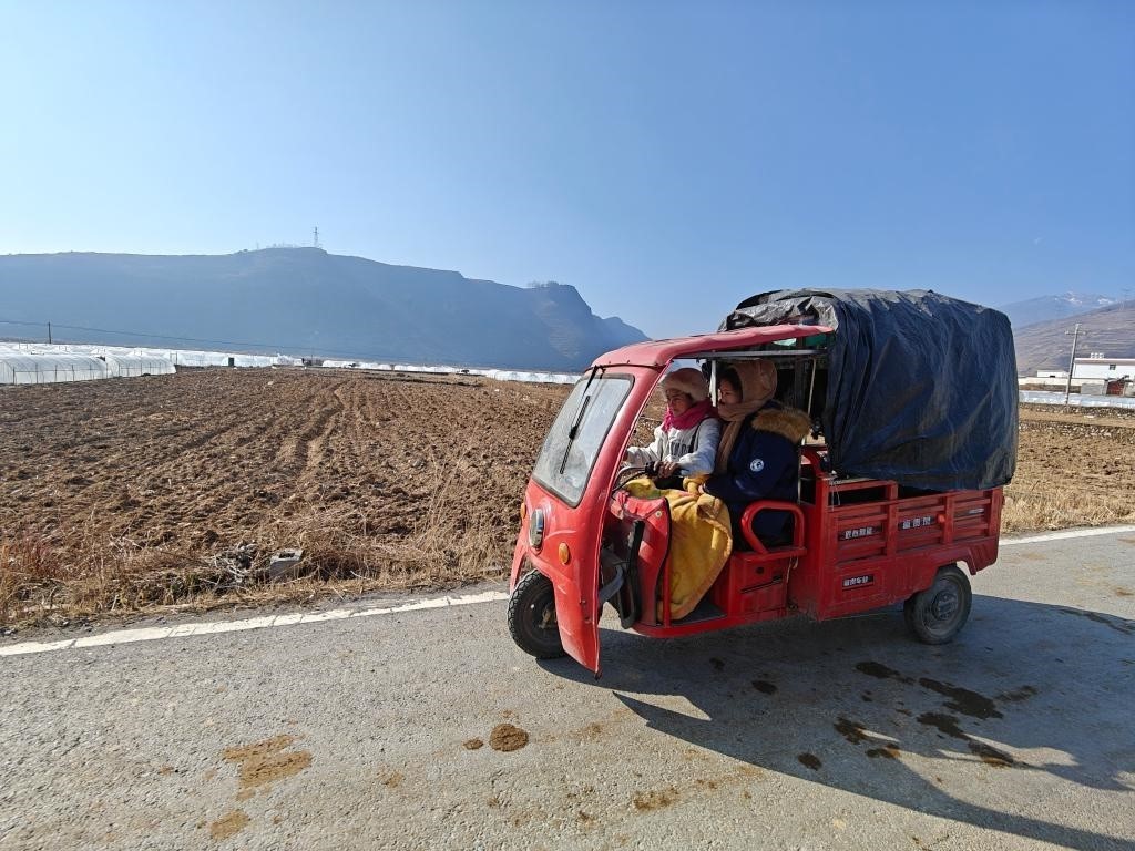巴木和大女兒騎著三輪車,經過烤煙育苗大棚。新華社記者 謝佼 攝