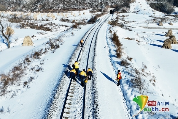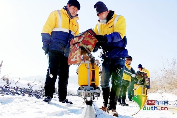 兩臺(tái)超聲波鋼軌探傷儀,在身穿橙黃色工作服的探傷工的推行下,緩緩向線路遠(yuǎn)方走去。寒風(fēng)中,探傷工們從頭到腳的防寒裝備也為他們?cè)诙臼彝庾鳂I(yè)提供了保障。