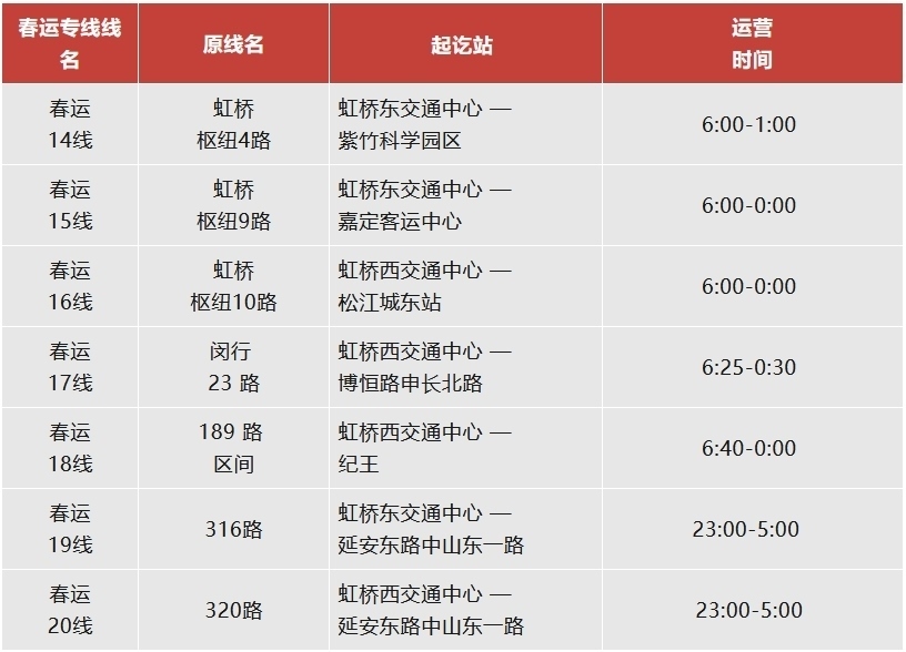 注:虹橋樞紐春運臨時專線運營日期為2月14日至2月23日。