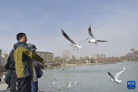 春日里,不少紅嘴鷗飛經(jīng)寧夏銀川,在湖泊濕地休整覓食,吸引市民前來觀賞投喂。