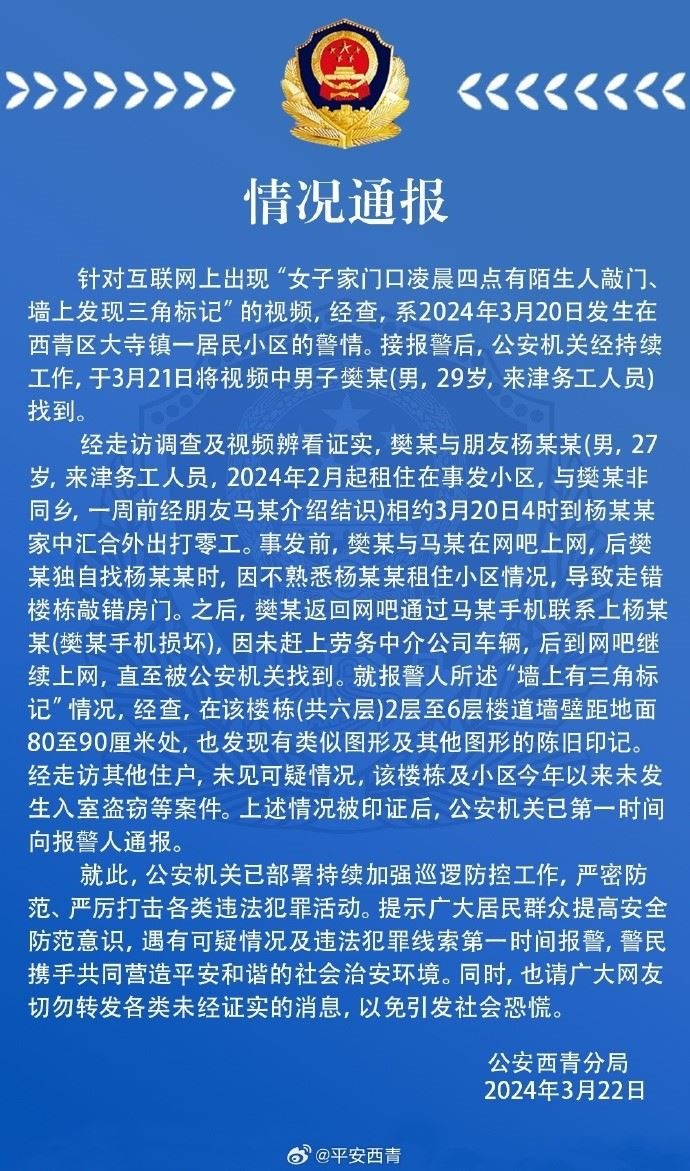 經(jīng)走訪調(diào)查及視頻辨看證實(shí),樊某與朋友楊某某(男,27歲,來津務(wù)工人員,2024年2月起租住在事發(fā)小區(qū),與樊某非同鄉(xiāng),一周前經(jīng)朋友馬某介紹結(jié)識)相約3月20日4時(shí)到楊某某家中匯合外出打零工。事發(fā)前,樊某與馬某在網(wǎng)吧上網(wǎng),后樊某獨(dú)自找楊某某時(shí),因不熟悉楊某某租住小區(qū)情況,導(dǎo)致走錯(cuò)樓棟敲錯(cuò)房門。之后,樊某返回網(wǎng)吧通過馬某手機(jī)聯(lián)系上楊某某(樊某手機(jī)損壞),因未趕上勞務(wù)中介公司車輛,后到網(wǎng)吧繼續(xù)上網(wǎng),直至被公安機(jī)關(guān)找到。就報(bào)警人所述“墻上有三角標(biāo)記”情況,經(jīng)查,在該樓棟(共六層)2層至6層樓道墻壁距地面80至90厘米處,也發(fā)現(xiàn)有類似圖形及其他圖形的陳舊印記經(jīng)走訪其他住戶,未見可疑情況,該樓棟及小區(qū)今年以來未發(fā)生入室盜竊等案件。上述情況被印證后,公安機(jī)關(guān)已第一時(shí)間向報(bào)警人通報(bào)。